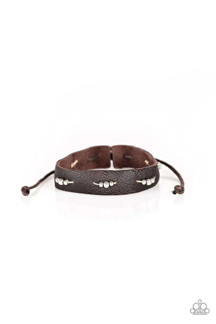 Threaded along a dainty brown cord, trios of shimmery silver beads are stitched across the front of a brown leather band for a seasonal look. Features an adjustable sliding knot closure.