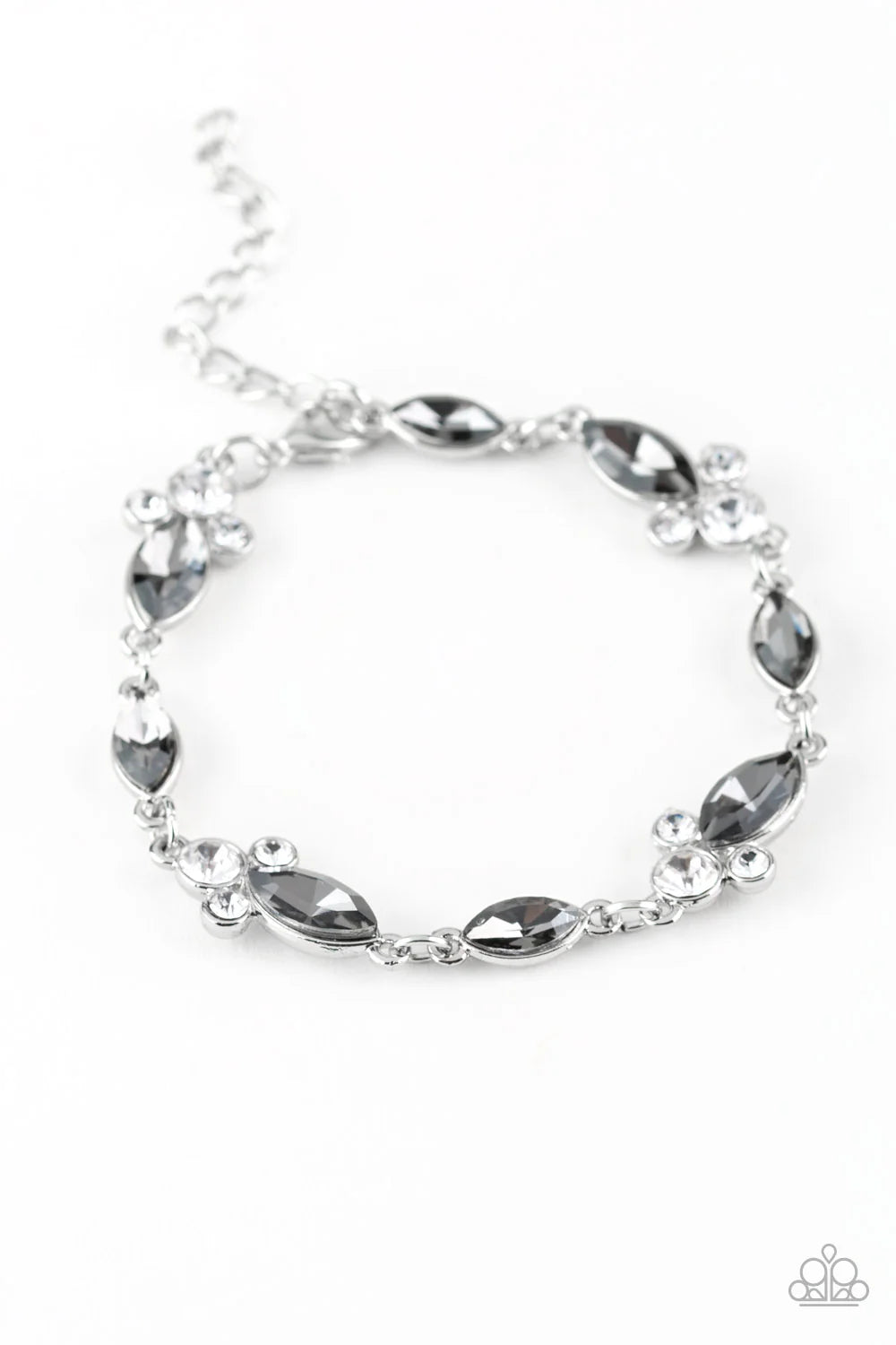Infused with trios of glassy white rhinestones, glittery smoky marquise-cut rhinestones link around the wrist for a refined look. Features an adjustable clasp closure.