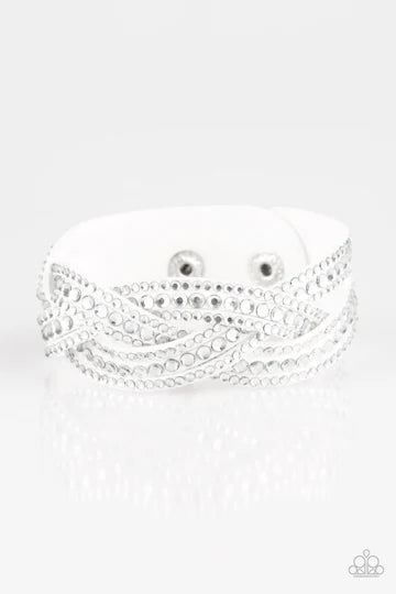 Varying in size, glassy white rhinestones are encrusted along interwoven white suede bands, creating blinding shimmer across the wrist. Features an adjustable snap closure.