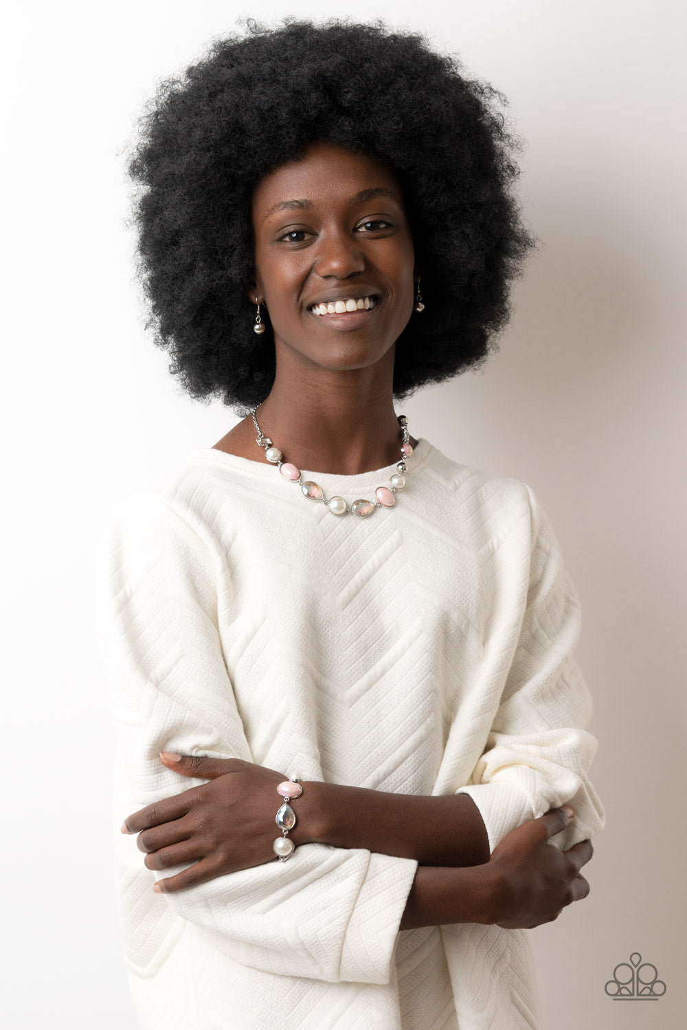 A collection of classic white pearls, iridescent Pale Rosette beads, and iridescent crystal-like teardrops wrap around the wrist in an ethereal display. Shiny silver frames encase each bead, adding a romantic vibe to the vintage inspired design. Features an adjustable clasp closure.