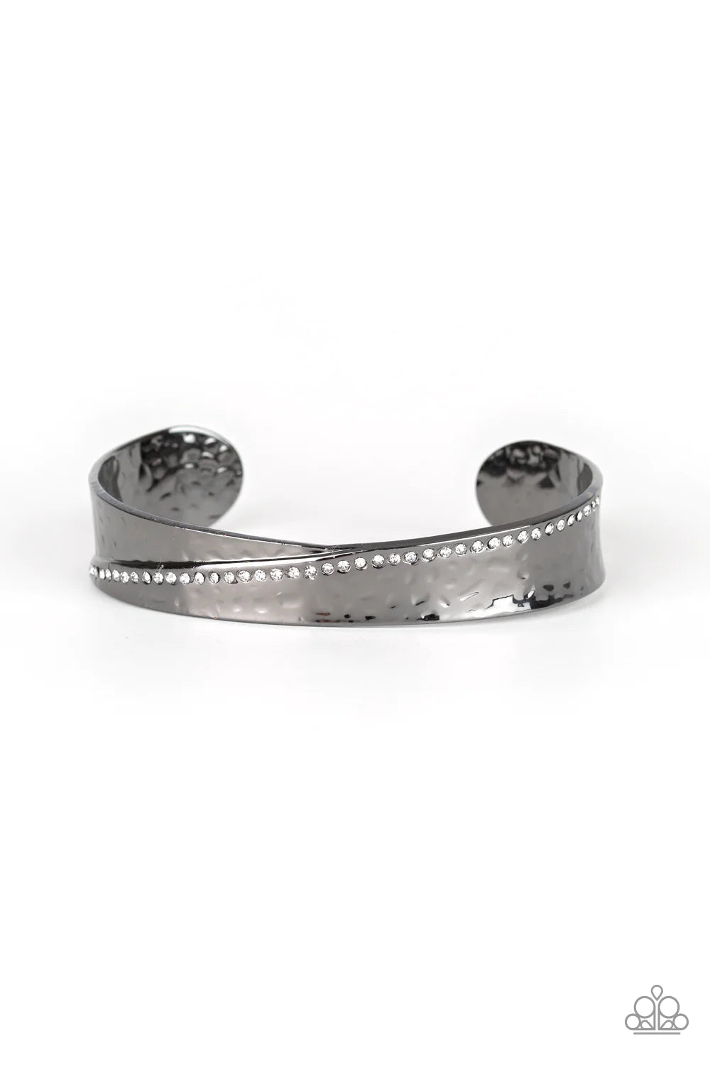 A row of glassy white rhinestones slants across the front of a hammered gunmetal cuff for a refined look.