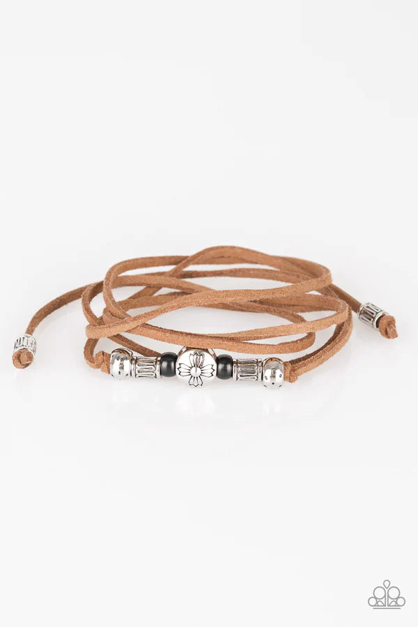 An array of black and silver beads are knotted in place along elongated suede cording for a wanderlust fashion. To secure bracelet, tie ends in place around the wrist at desired length.
