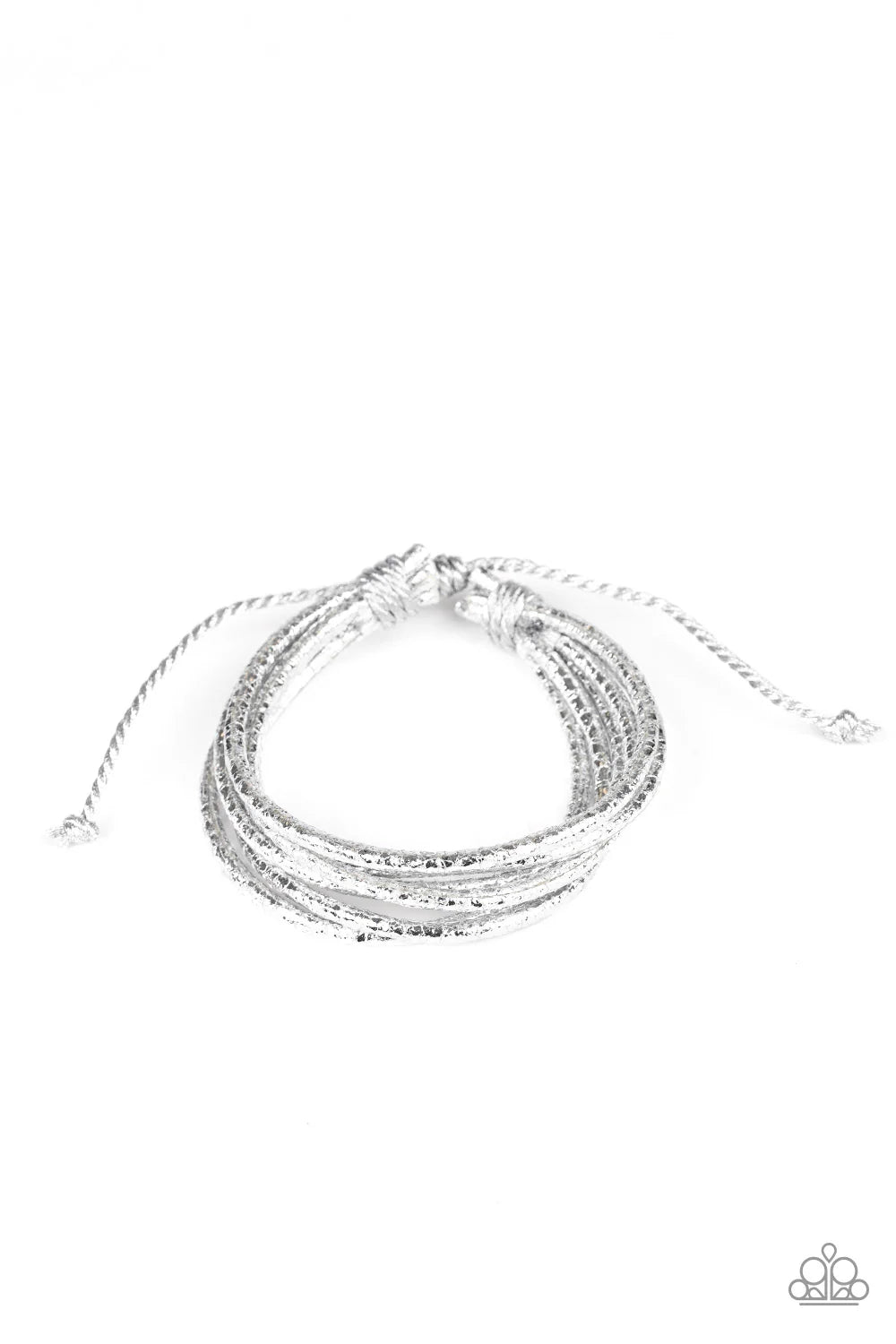 Brushed in a shimmery metallic finish, silvery leather cords layer across the wrist for a trendy look. Features an adjustable sliding knot closure.