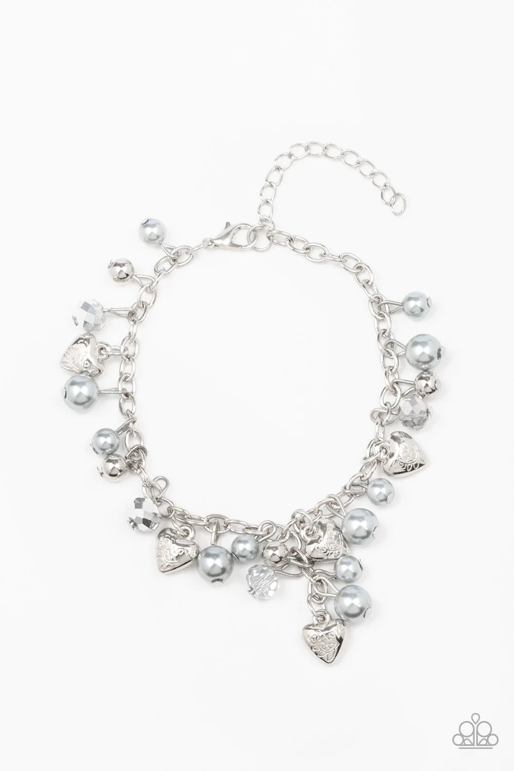 A charming collection of silver pearls, metallic crystal-like beads, and ornate silver heart charms dangle from the wrist, creating a flirtatious fringe. Features an adjustable clasp closure. Sold as one individual bracelet.