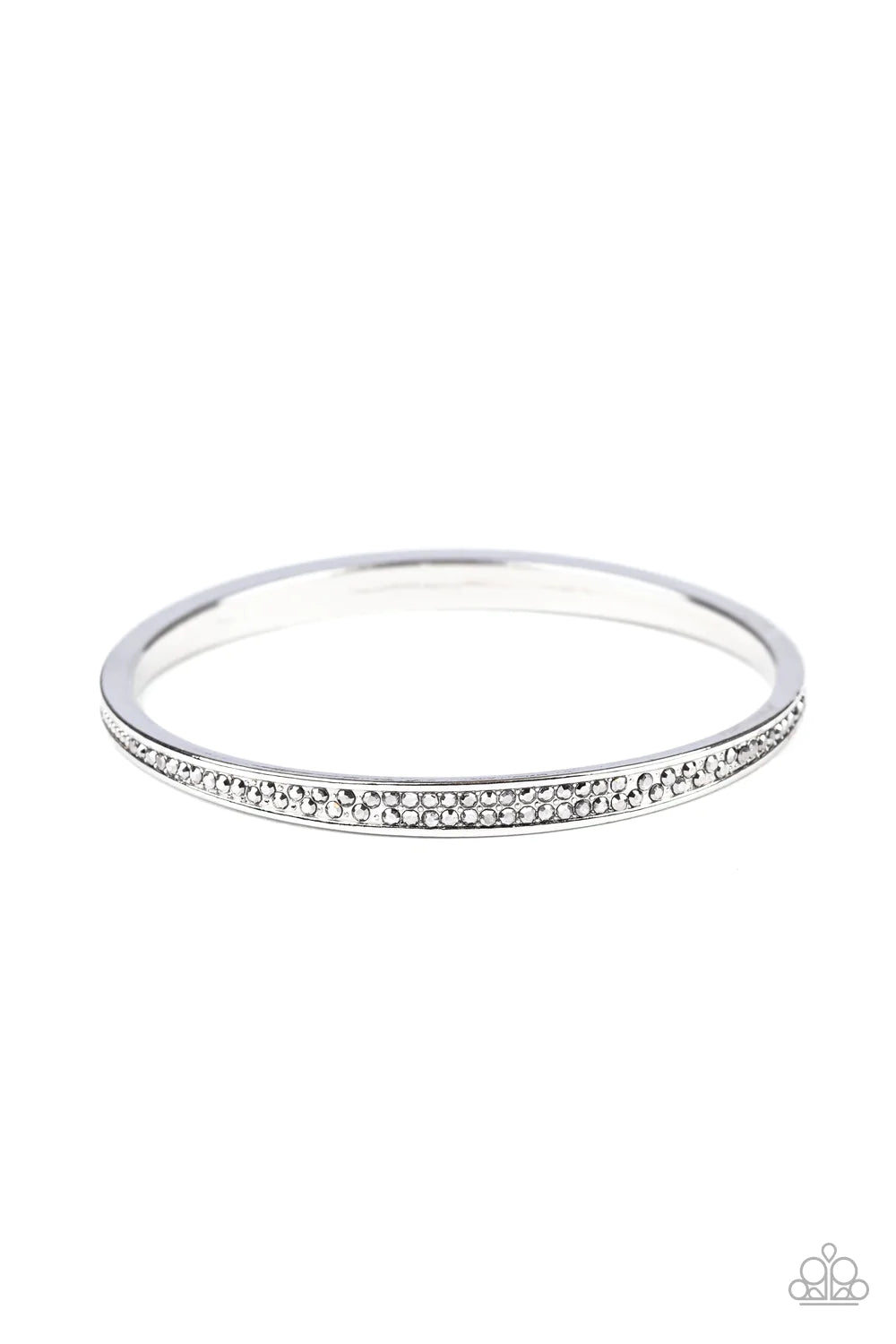 Rows of dainty hematite rhinestones have been encrusted along the front of a thick asymmetrical silver bangle for a timeless twist. Sold as one individual bracelet.
