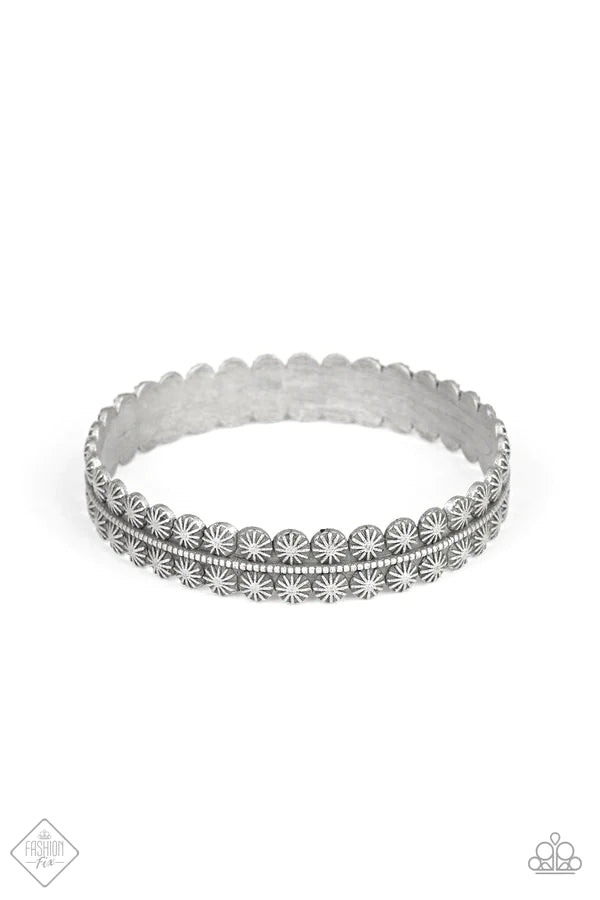 Brushed in an aged tin finish, an ornately studded bangle encircles the wrist as a gorgeous rustic accent.