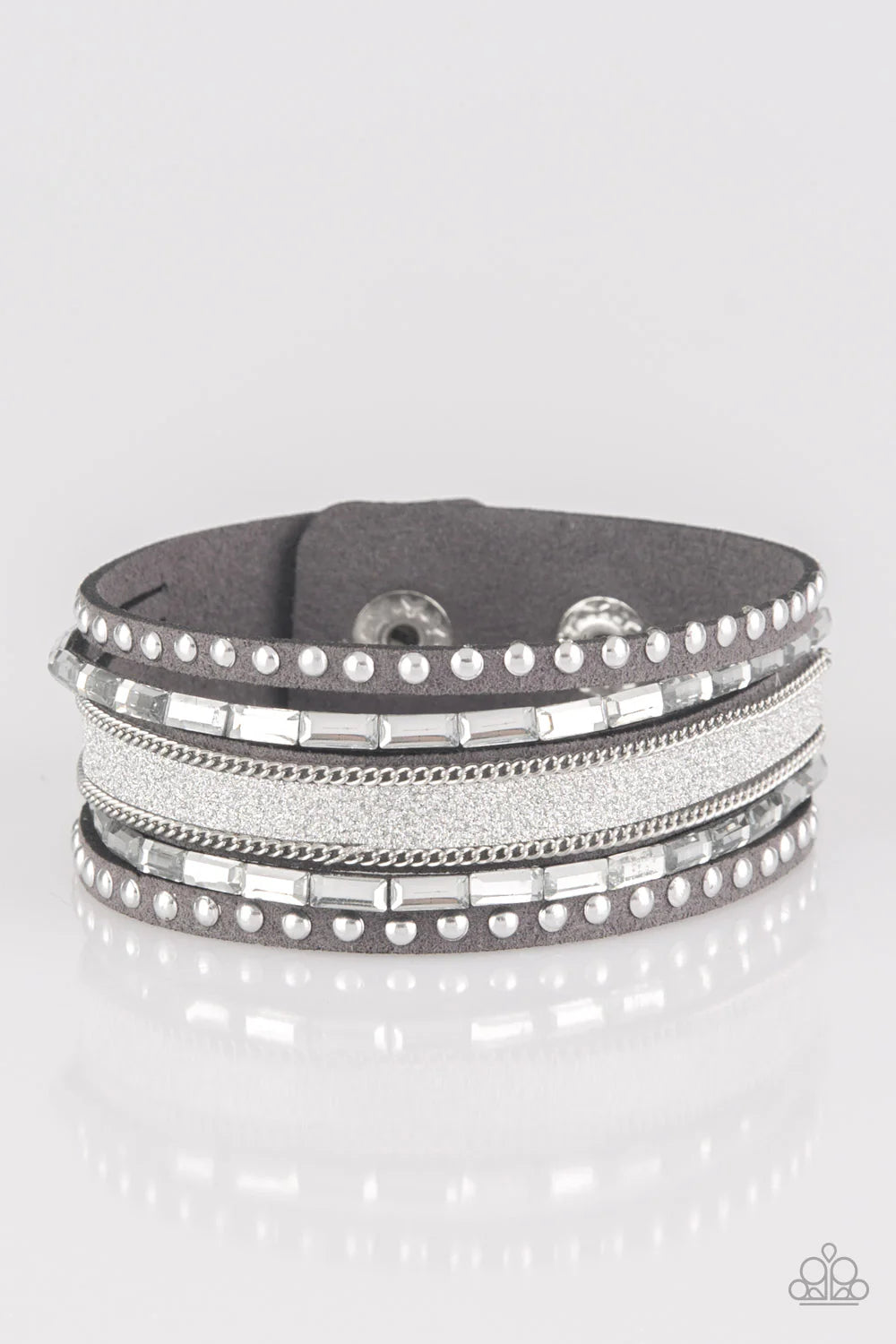 Shimmery silver studs, dainty silver chains, and white emerald style cut rhinestones are encrusted along a gray suede band dusted in a sparkling center for a sassy look. Features an adjustable snap closure.