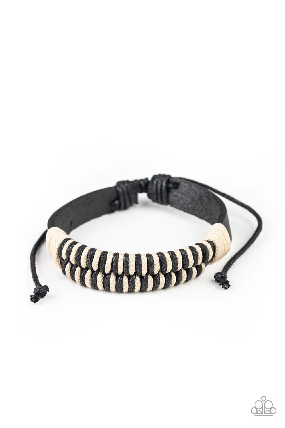 Black and white twine knots around a black leather band for a rustic look. Features an adjustable sliding knot closure. Sold as one individual.