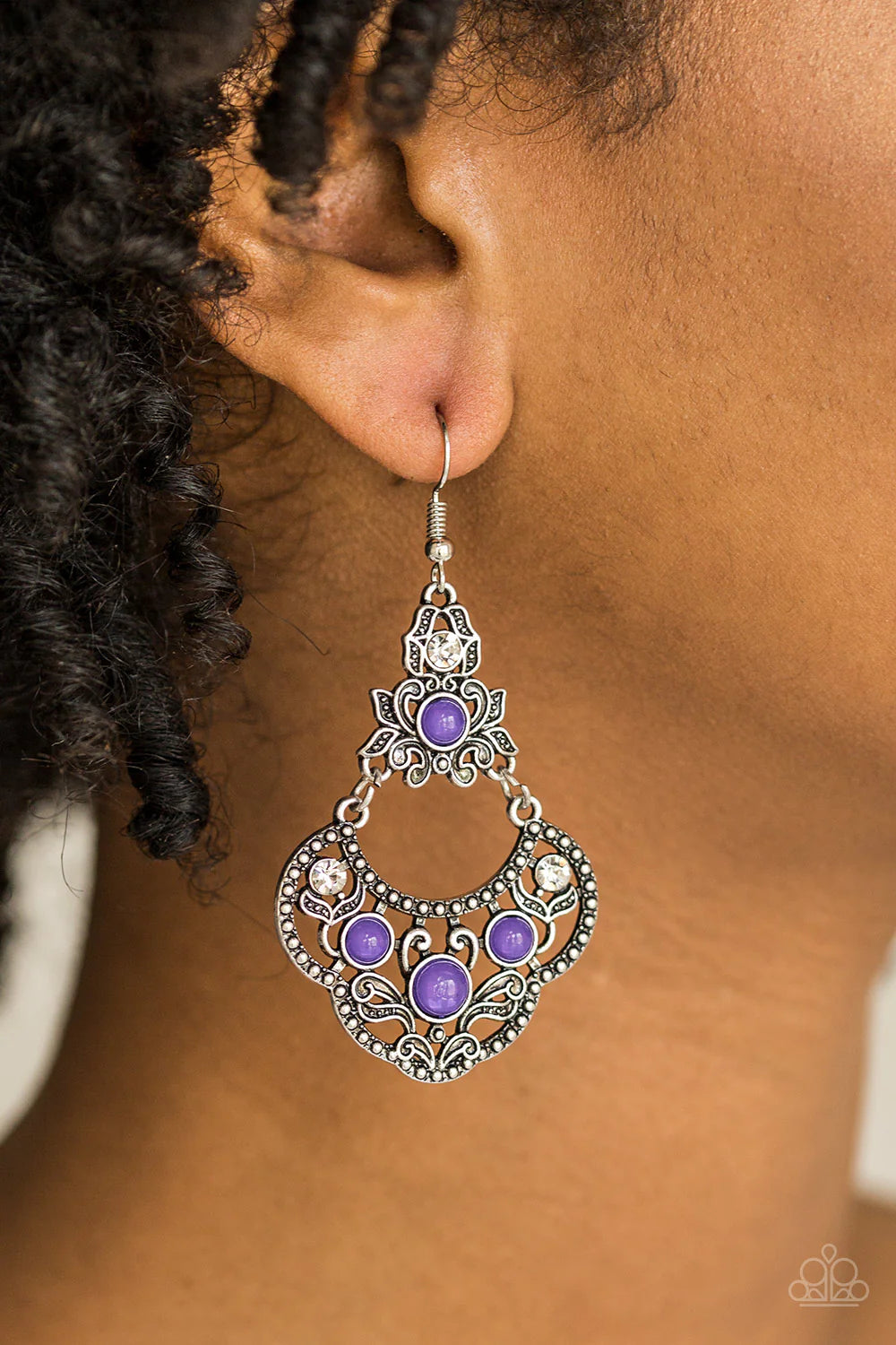 Glowing purple beads and glittery white rhinestones are sprinkled along an ornate silver frame radiating with leafy filigree for a whimsical look. Earring attaches to a standard fishhook fitting.