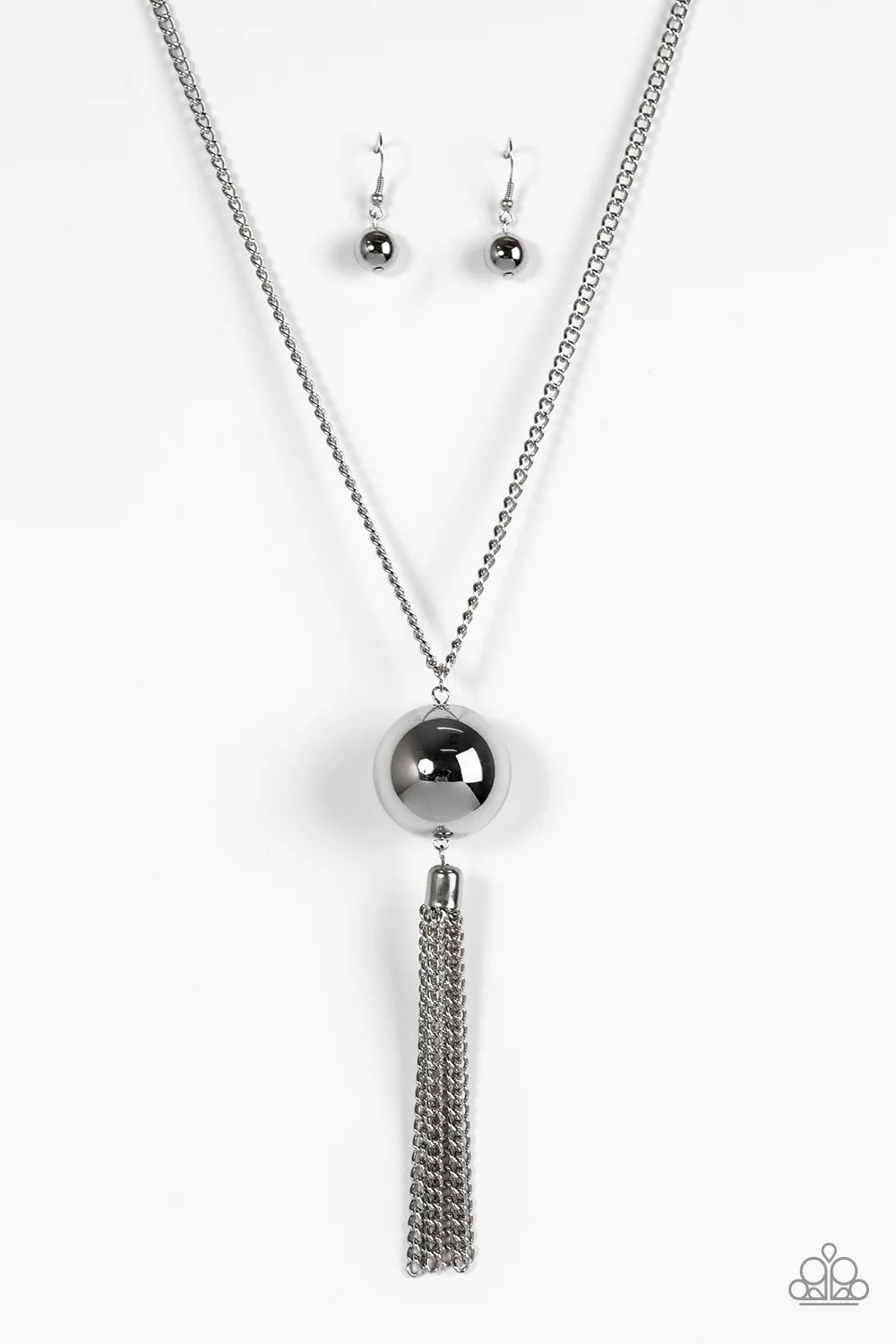 An oversized gunmetal bead swings from the bottom of a glistening gunmetal chain, creating a dramatic pendant. Matching gunmetal chains stream from the bottom of the bead for a bold industrial look. Features an adjustable clasp closure.
