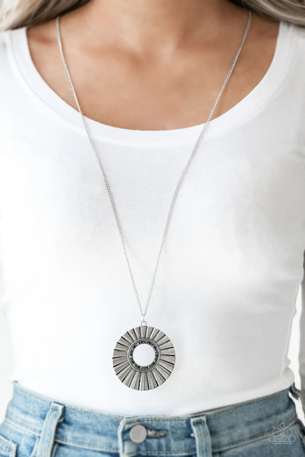 Brushed in a gritty antiqued finish, a rippling silver frame flares from a multicolored rhinestone encrusted center for an edgy look. Features an adjustable clasp closure.