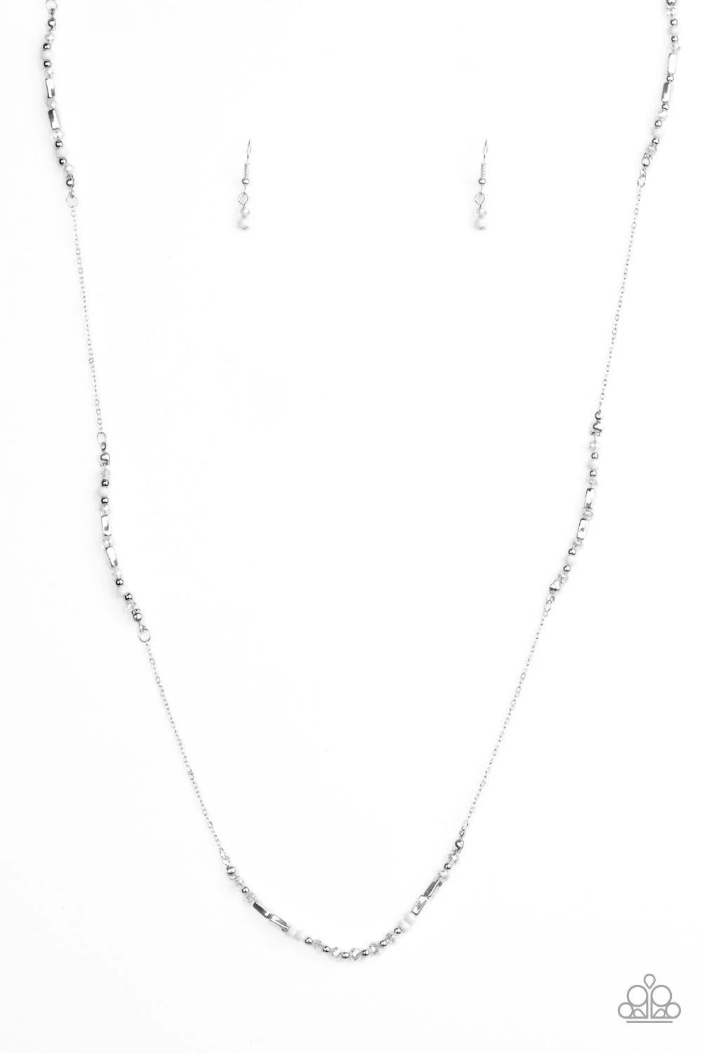 Sections of faceted white beads, dainty silver beads, silver rectangular accents, and crystal-like beads trickle along a dainty silver chain for a colorful look. Features an adjustable clasp closure. Sold as one individual necklace. Includes one pair of matching earrings.