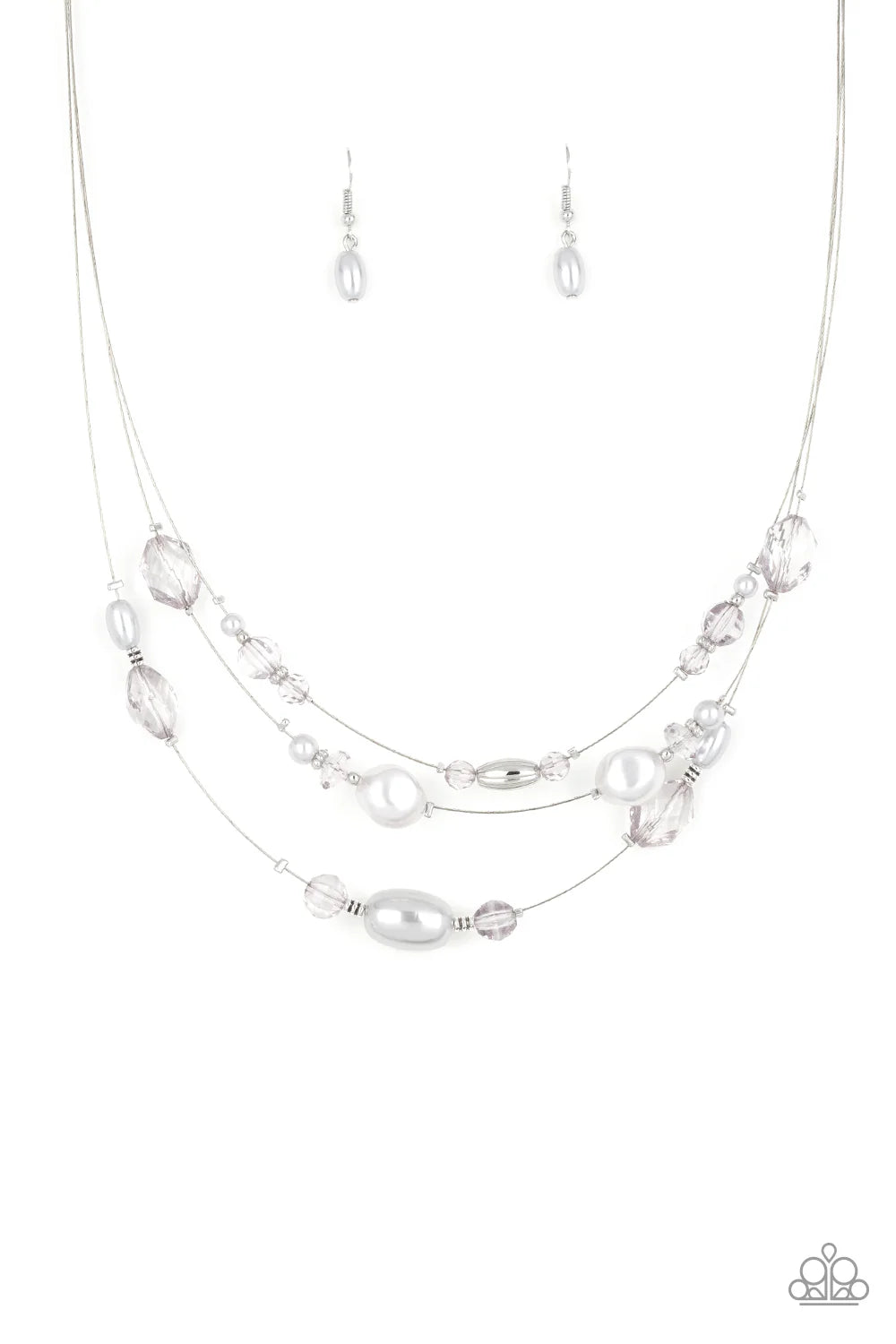An elegant collection of pearly gray, dainty silver, and sparkling crystal-like beads are fitted in place along three silver wires below the collar, creating the illusion of floating layers. Features an adjustable clasp closure. Sold as one individual necklace. Includes one pair of matching earrings.