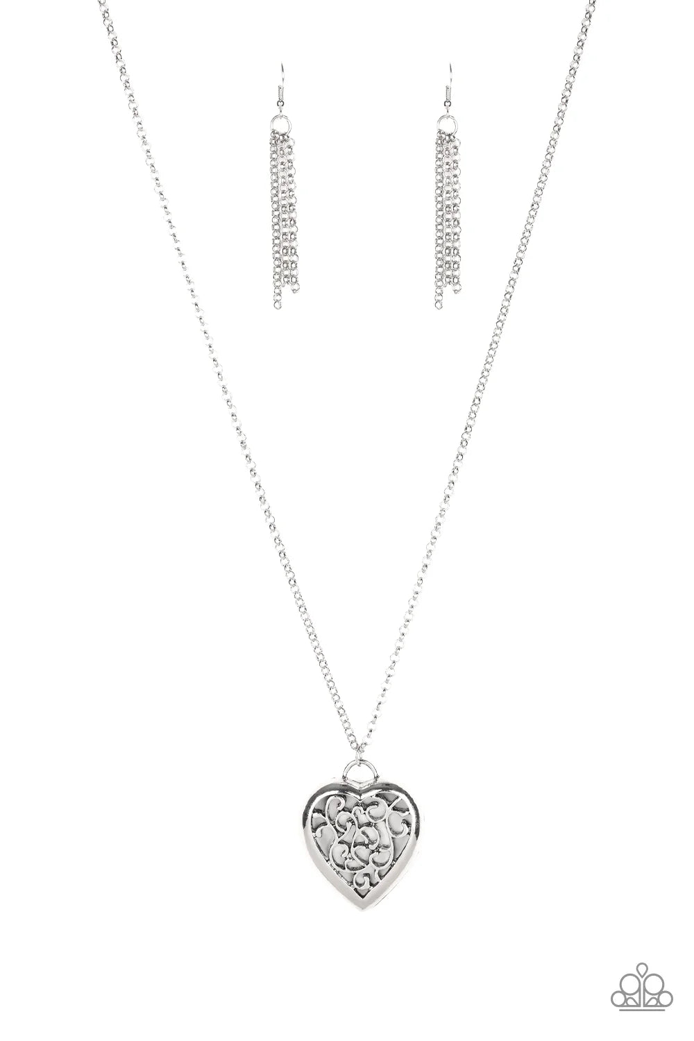 Featuring vine-like filigree, a dramatic locket-like heart swings from the bottom of a lengthened silver chain for a vintage inspired look. Features an adjustable clasp closure.