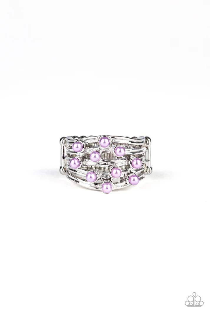 Dainty purple pearls dot the tops of layered silver bands, coalescing into a bubbly centerpiece atop the finger. Features a stretchy band for a flexible fit.