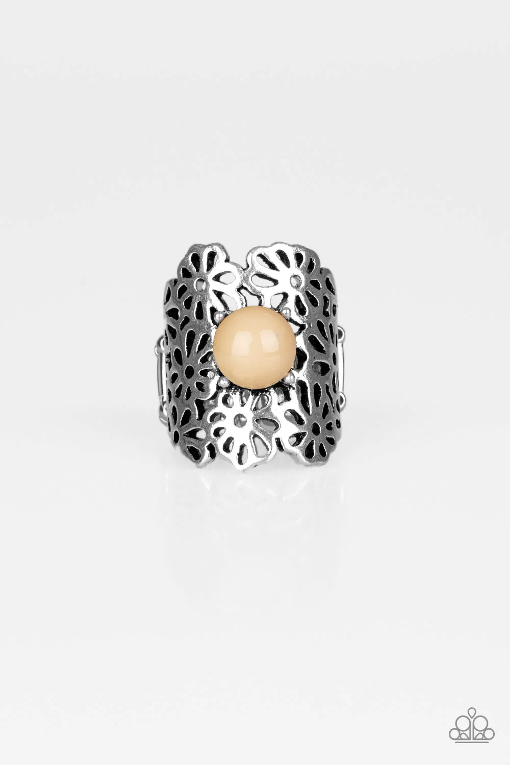 A collection of airy silver flowers coalesce into a thick silver band. A polished Soybean bead dots the center, adding a perfect pop of color to the seasonal piece. Features a stretchy band for a flexible fit. Sold as one individual ring.
