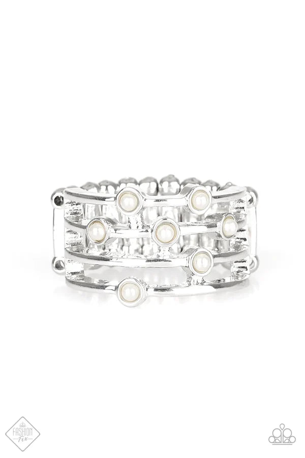 Dainty white pearls haphazardly dot the tops of dainty silver bands, adding a modern scattered look to the timelessly layered palette. Features a dainty stretchy band for a flexible fit.