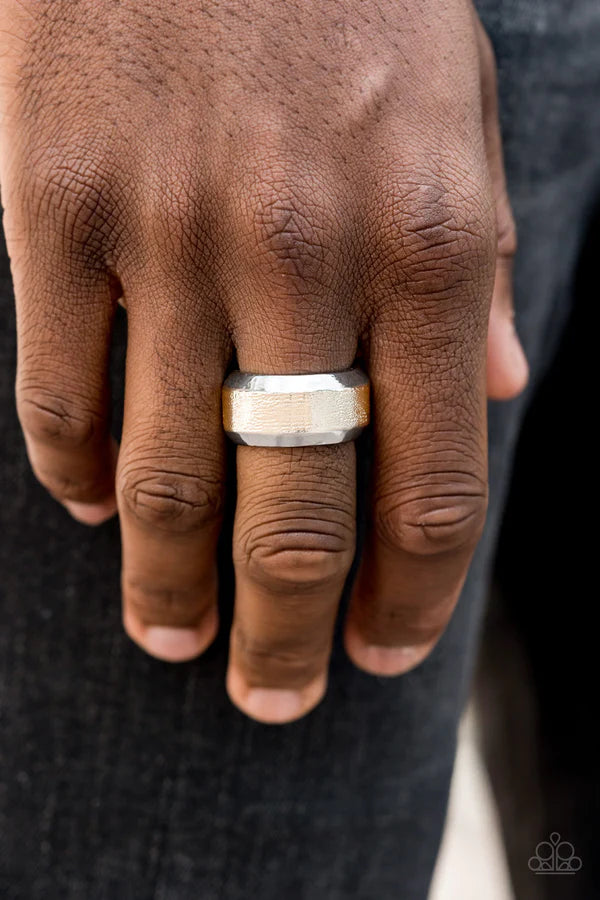 The center of a beveled silver band has been delicately hammered in shimmery gold detail for a metro inspired look. Features a stretchy band for a flexible fit.