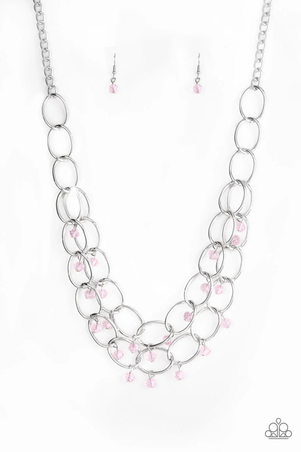 Pink crystal-like beads swing from two layers of oversized silver links below the collar for a refined look. Features an adjustable clasp closure.